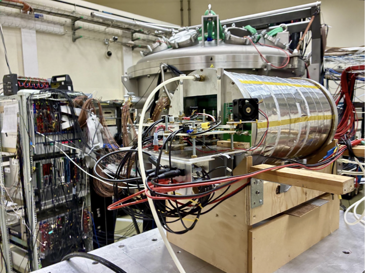 Inside this time projection chamber, the argon gas mixture serves as the target area to detect the protons coming in. If you look closely at the silver cylinder you can see a black square - this is the detector part of the chamber - the cuboid in the interactive mock-ups below. This picture was taken by Blahoslav Rataj.