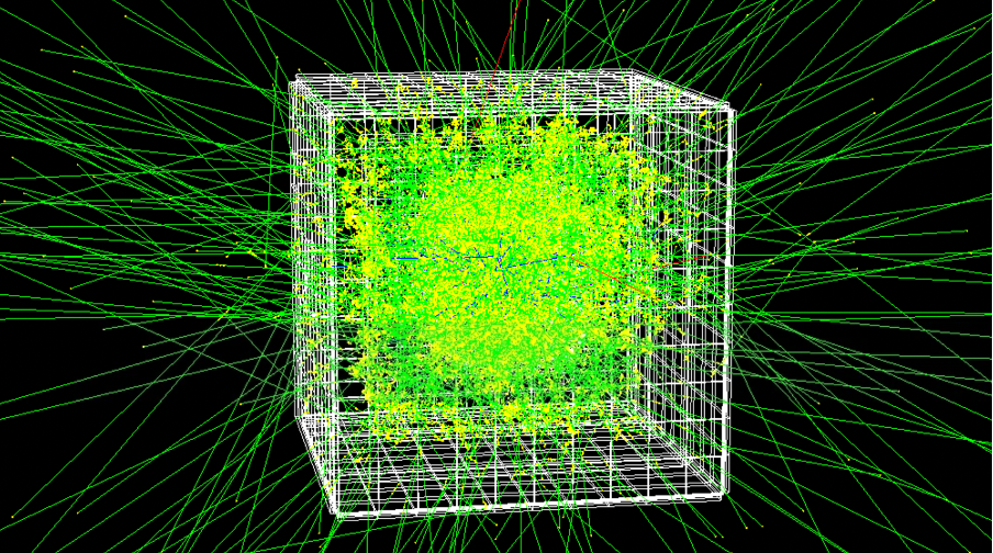 This is the full detector planned at the ESS in the future. It was not the subject of this project but we can look at it in comparison to the prototype. They are of similar sizes - the TPCs would both be able to fit on a desk, and made of similar materials (argon gas mixture). The key difference is all of the extra material around the TPC. We can see the rounded cube TPC in the centre, with a larger cube around it. This material around the TPC is called a "cosmic veto", and will massively reduce the cosmic muon radiation mentioned in the previous section (the most persisent background effect in this experiment that reduces the quality of our data). The detector will be detecting neutrons that have collided witha rotating tungsten target. This neutron beam is difficult to work with as neutrons have no charge so we cannot guide them with magnets like protons